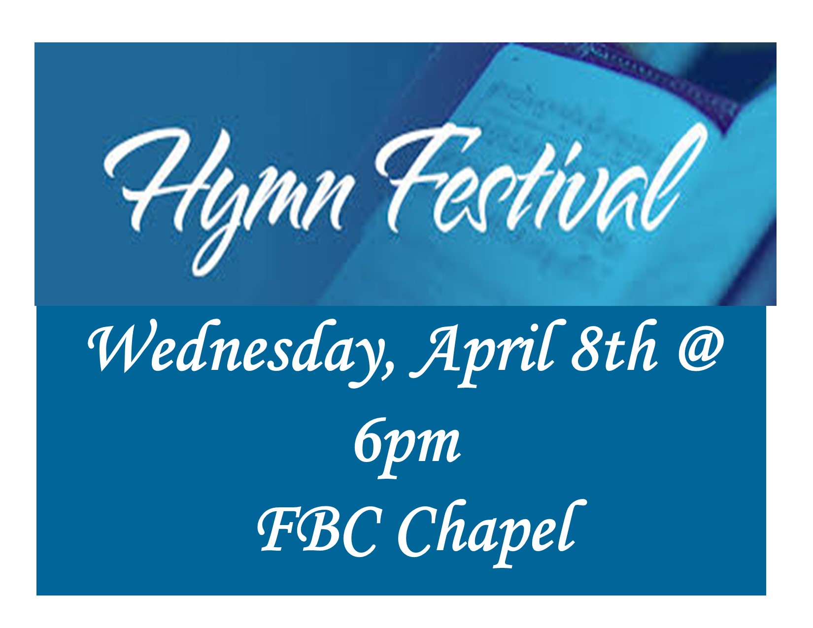 Hymn Festival Wednesday, April 8th @ 6:00 pm Join us in the FBC Chapel. All are welcome! + Add to Google Calendar + iCal / Outlook export 00 days 00 hours 00 minutes 00 seconds Date Apr 08 2026 Time 6:00 pm - 7:00 pm Category Music Share this event